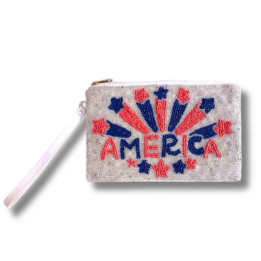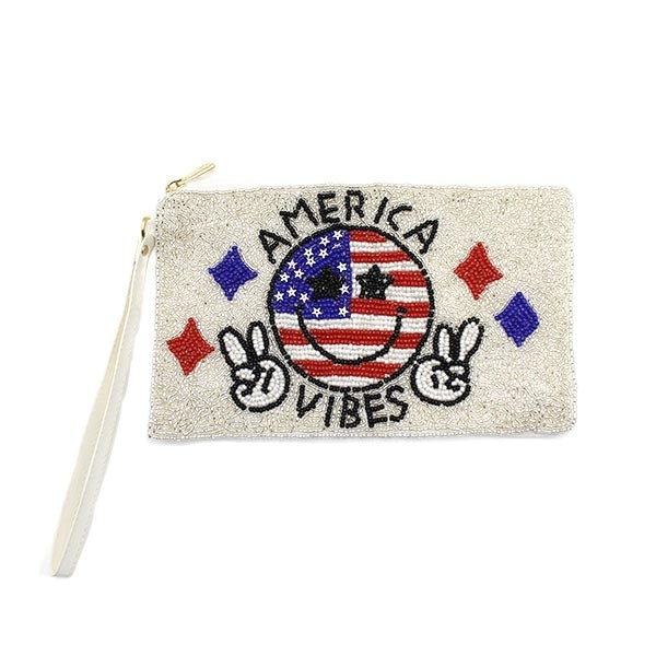 Celebrate your love for the USA with our collection of patriotic beaded wristlet purses! Featuring unique and festive designs, these handcrafted purses are perfect for holidays, events, or everyday flair. Choose from styles like 'America' in bold beadwork, a fun smiley face throwing up peace signs with the phrase 'American Vibes,' a 'Stars and Stripes' design, or the timeless American flag. Each wristlet combines practicality with patriotic charm, making it the perfect accessory for showing off your red, white, and blue pride!