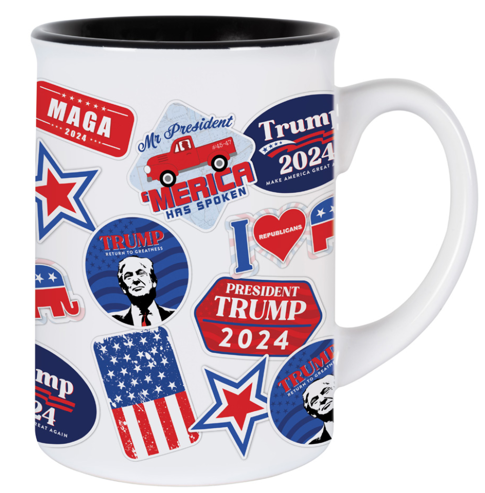 Celebrate the return of President Trump with this 20oz President Trump Sticker Mug! Wrapped with different Trump and patriot stickers. Enjoy morning coffee, tea or make your favorite mug cake with this President size mug!