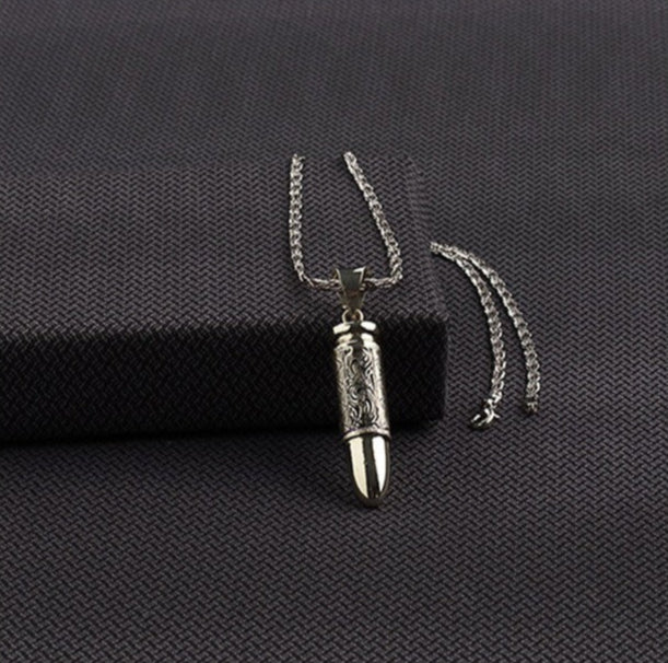 Make a bold statement with this intricately designed bullet pendant necklace. Featuring a striking engraved bullet-shaped pendant, this piece hangs elegantly on a matching chain, blending edgy style with sophistication. Perfect for adding a unique touch to your outfit or gifting to someone special.