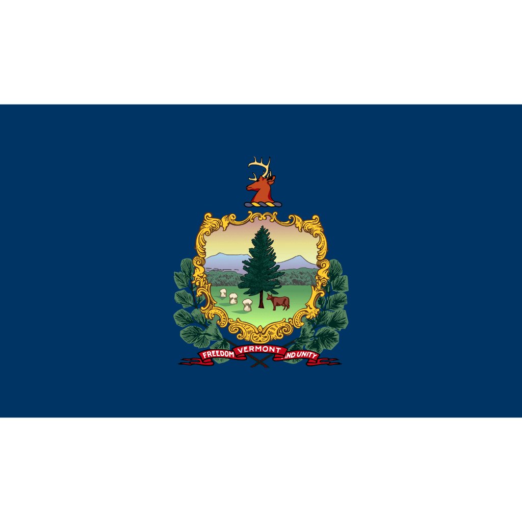 Discover the beauty of Vermont's natural landscape encapsulated in our Vermont state flag. With a serene blue background adorned by a majestic pine tree and a pair of grazing deer, this flag embodies Vermont's deep connection to its lush forests and abundant wildlife. Dive into the symbolism of independence and resilience reflected in every detail, and explore the Green Mountain State's proud heritage. Whether you're a Vermont native, a nature enthusiast, or a collector of state flags, our Vermont flag is a timeless symbol of the state's enduring spirit and scenic wonders.